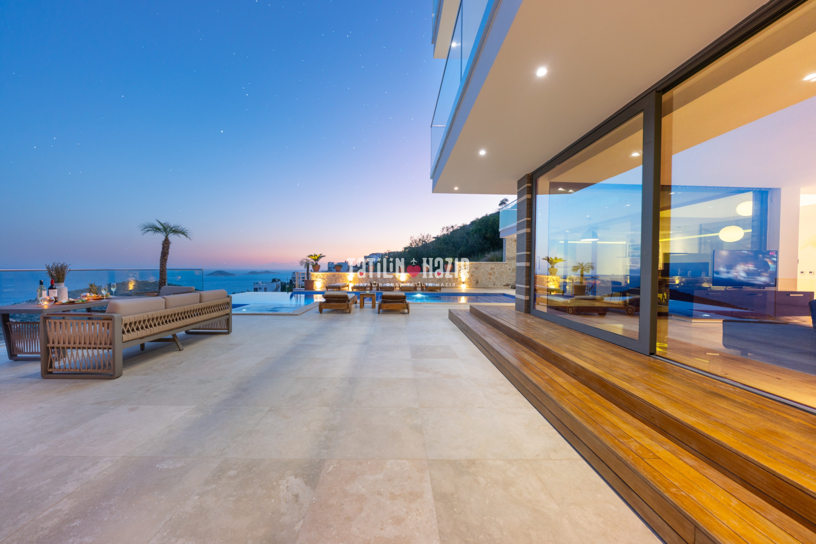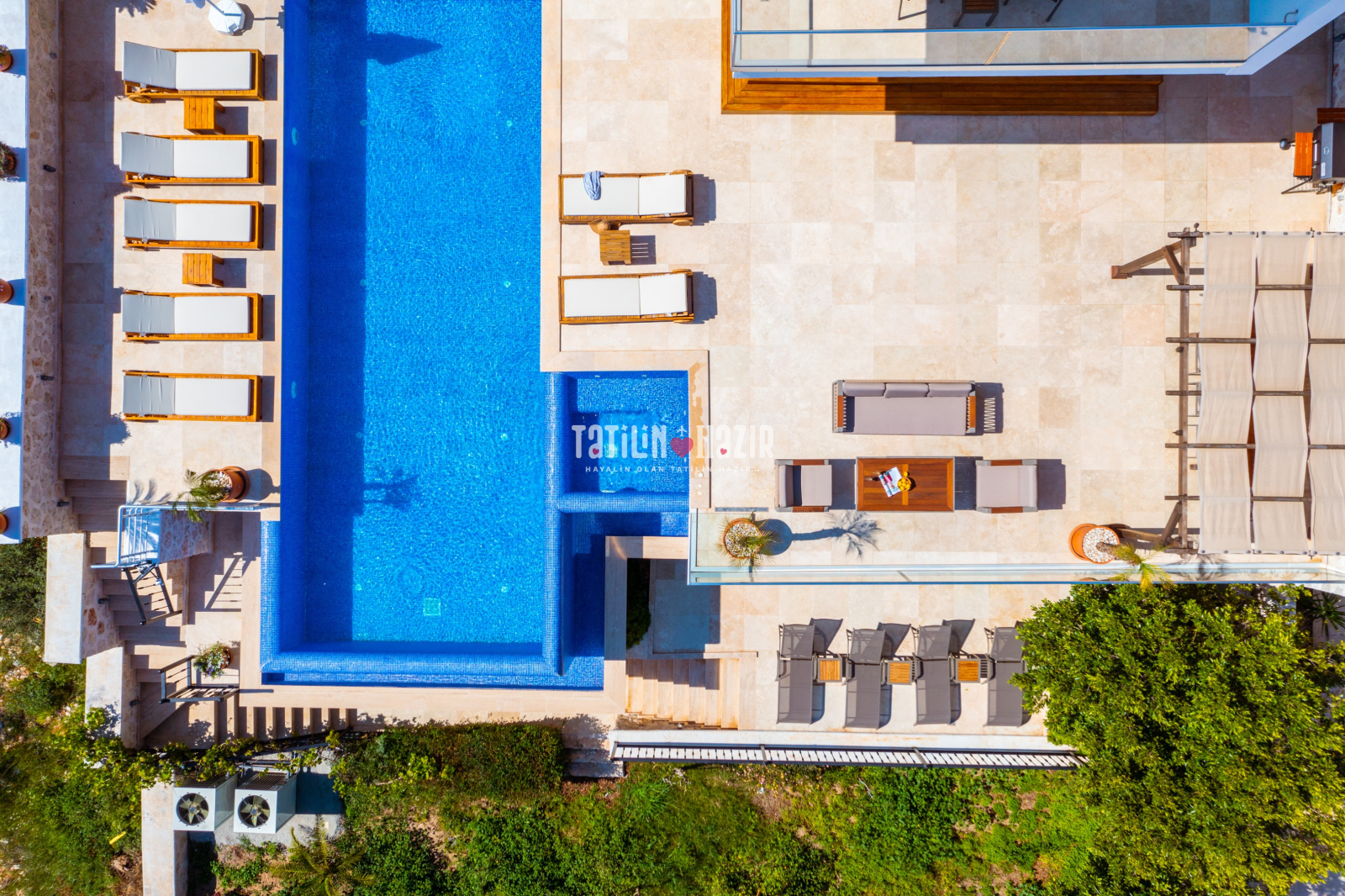 Havuz ve Bahçe: Oturma grubu , barbekü, şezlong, güneş şemsiyesi, yemek masası bulunmaktadır. Villamızın havuzundan sonsuzluk deniz manzarası görülmektedir.