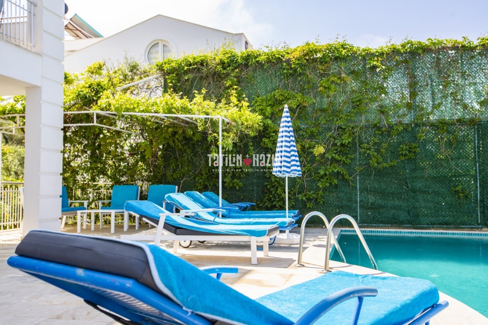 Villa Atlantis özel bahçe içerisinde özel havuz yüzme havuzu, şezlonglar, yemek masası ve sandalyeler, oturma grubu, güneş şemsiyesi ve barbekü bulunmaktadır.
