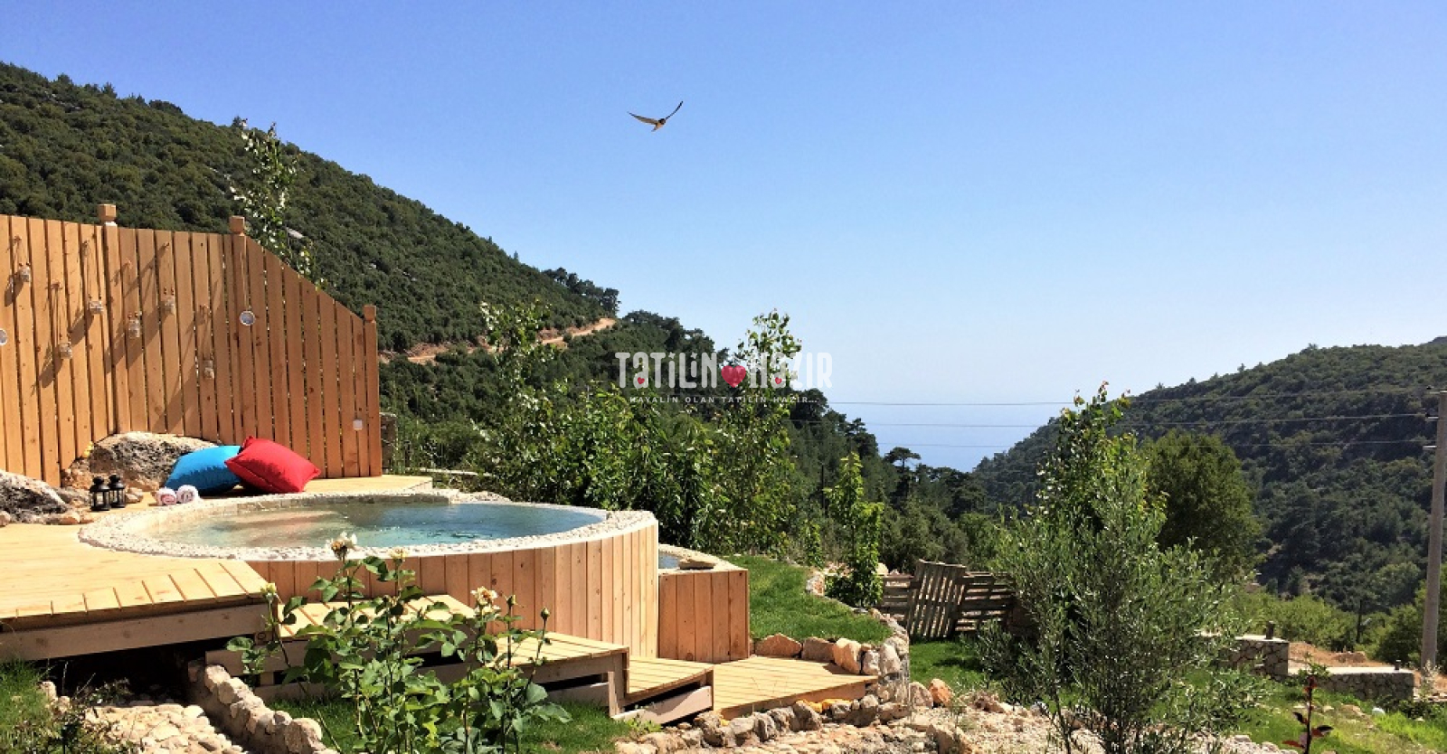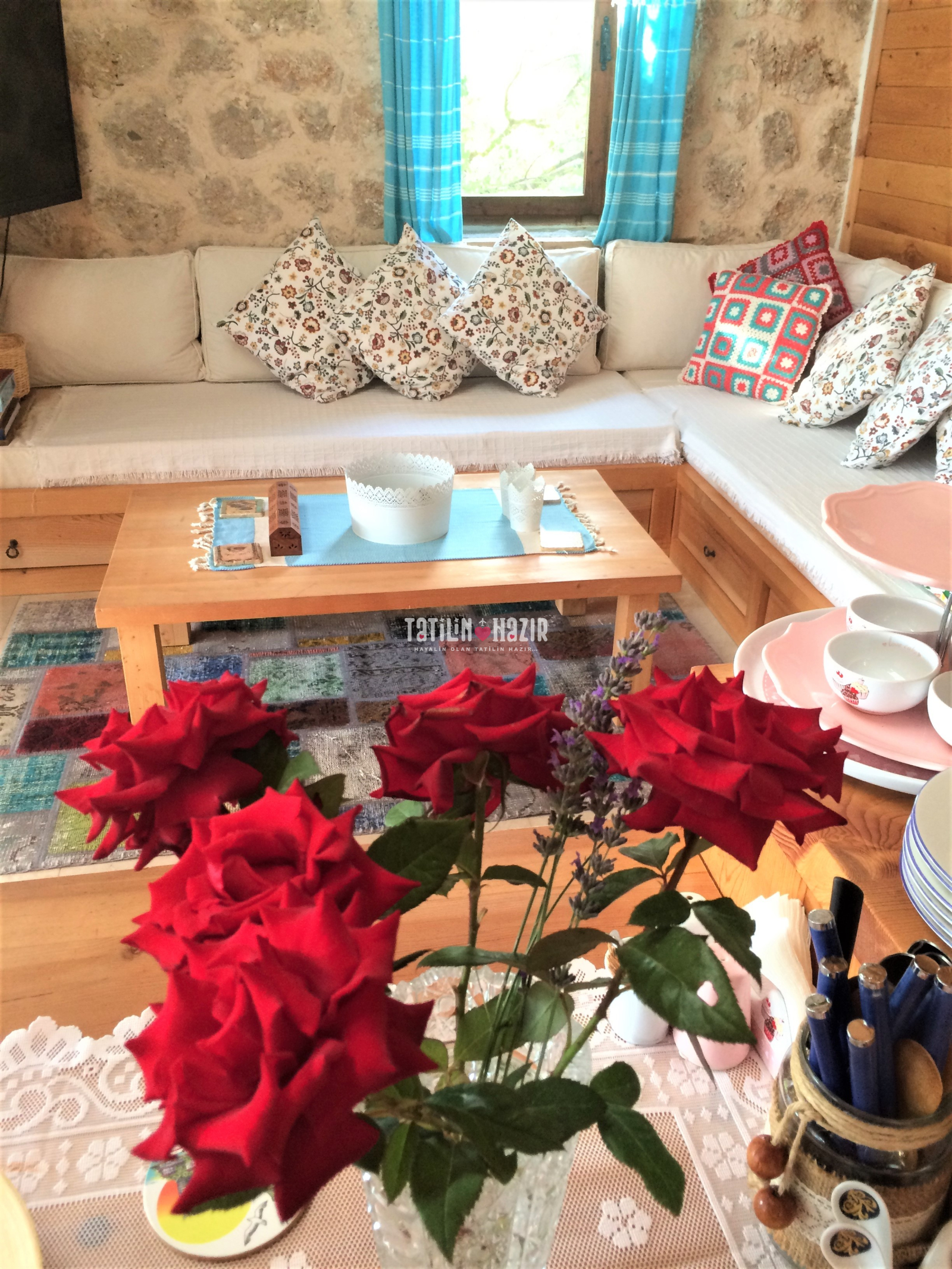 Badem Ev'e girdiğiniz anda sizi yüksek tavanlı, ahşap ve doğal taş dokunun sarmaladığı sıcak bir ortam bekliyor. Geniş cam yüzeylerden sizi kucaklayan Kaputaş Vadisi ve Akdeniz'in sonsuz ufku aydınlık ve ferah bir mekanın parçası olarak karşınıza çıkıyor. Geleneksel sedirli oturma odanızda en sevdiğiniz kitabınızı okuyabilir, televizyon seyredebilir ya da yalnızca yanıbaşınızda sizi saran huzur dolu doğanın keyfini çıkarabilirsiniz.