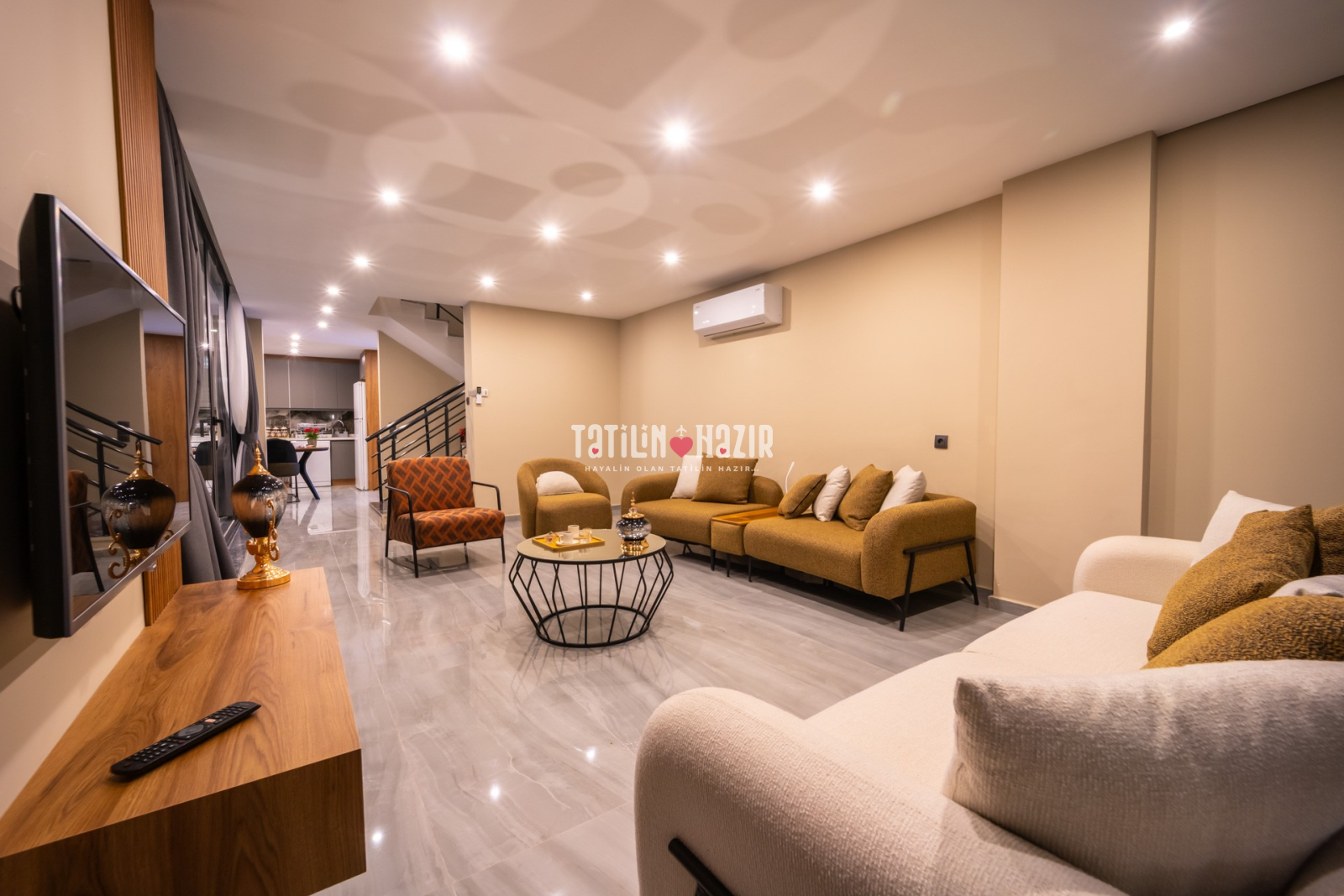 Modern Tasarım: Zarif iç dekorasyon, modern mobilyalar ve kaliteli malzemelerle tasarlanmış geniş bir yaşam alanı.