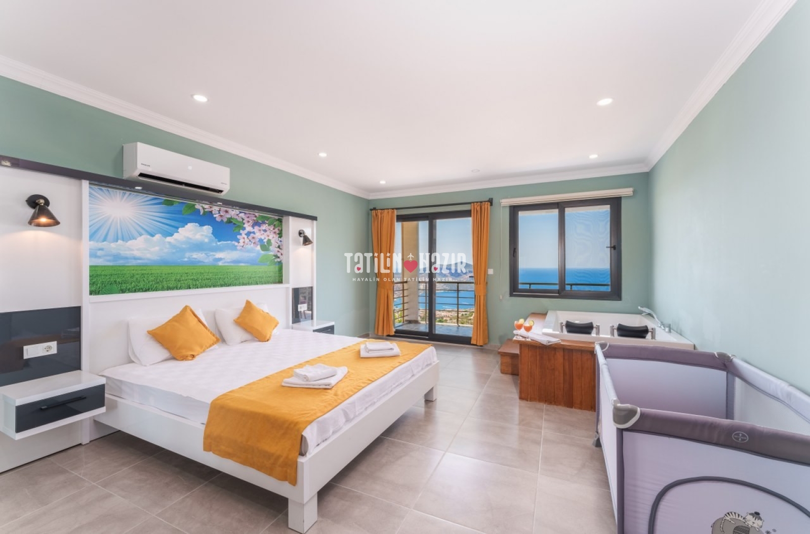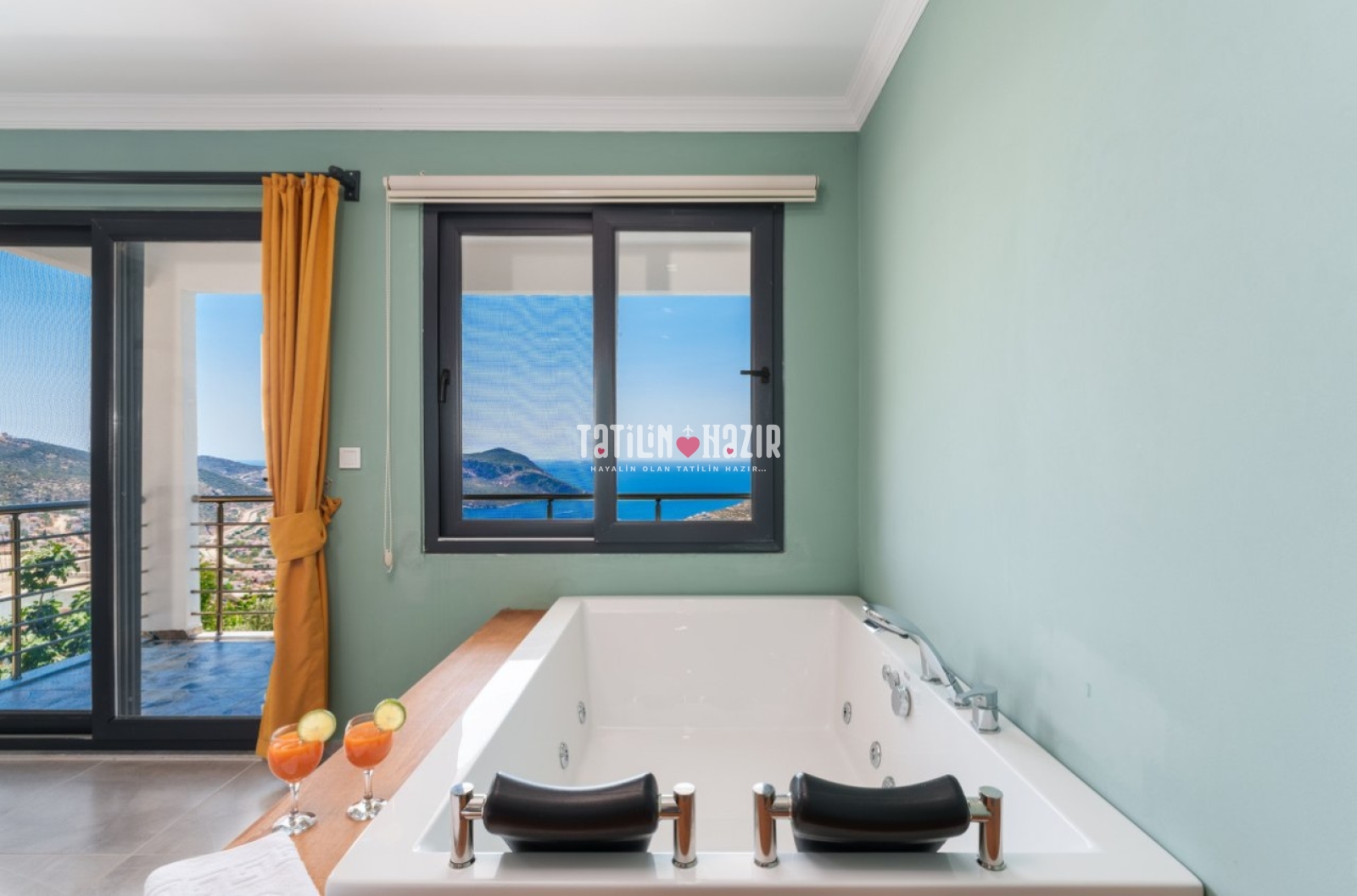 Jakuzili Oda: Şehirden uzak, deniz manzaralı doğa içinde dinlendirici bir tatil için jakuzili odanızda rahatlayın.