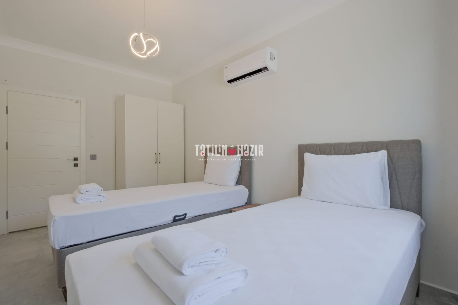 3️⃣ 3. Yatak Odası: 2 adet tek kişilik yatak, klima, makyaj masası, elbise dolabı, ortak banyo & WC
