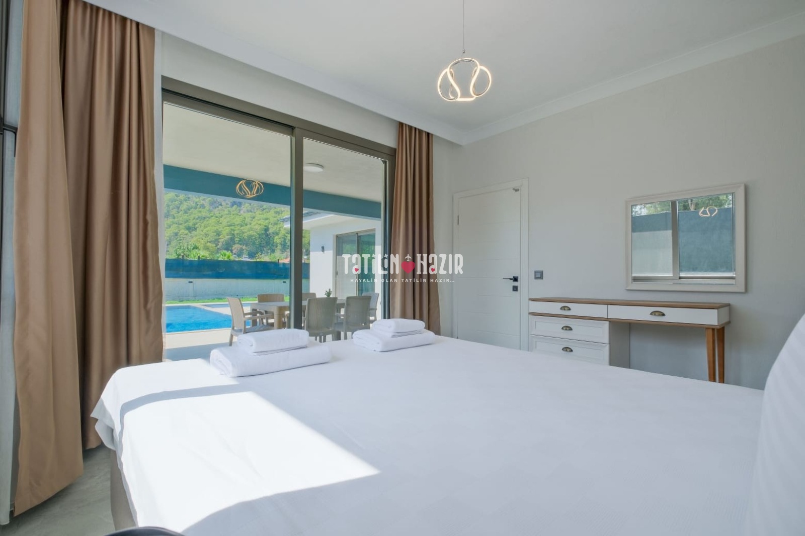 Oturma grubu, TV, orta sehpa, klima ve havuz terasına direkt çıkış mevcuttur.